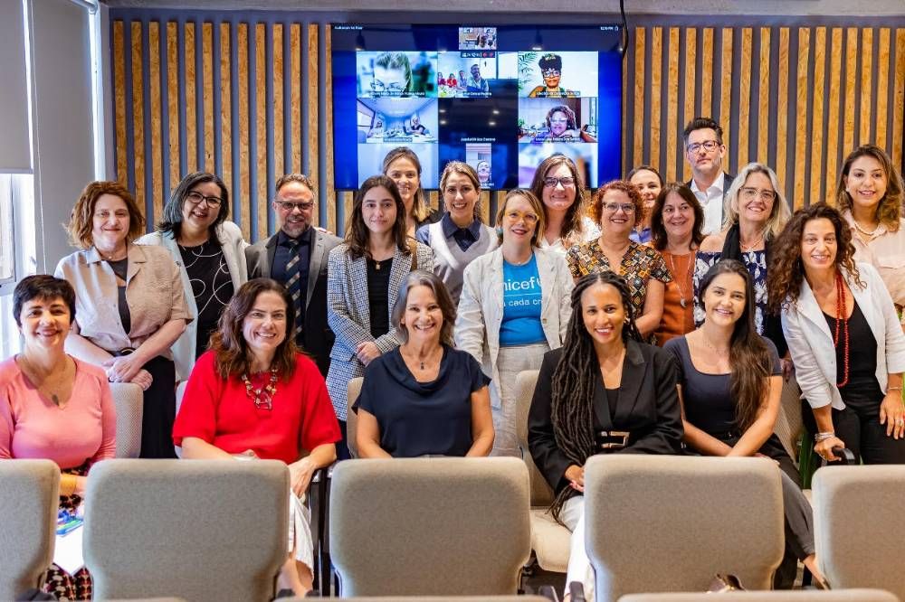 Diretora da SBIm Isabella Ballalai (na segunda fila, segunda da direita para a esquerda) durante a cerimônia de lançamento da UAPI - Ciclo 2025-2028. Foto: Unicef